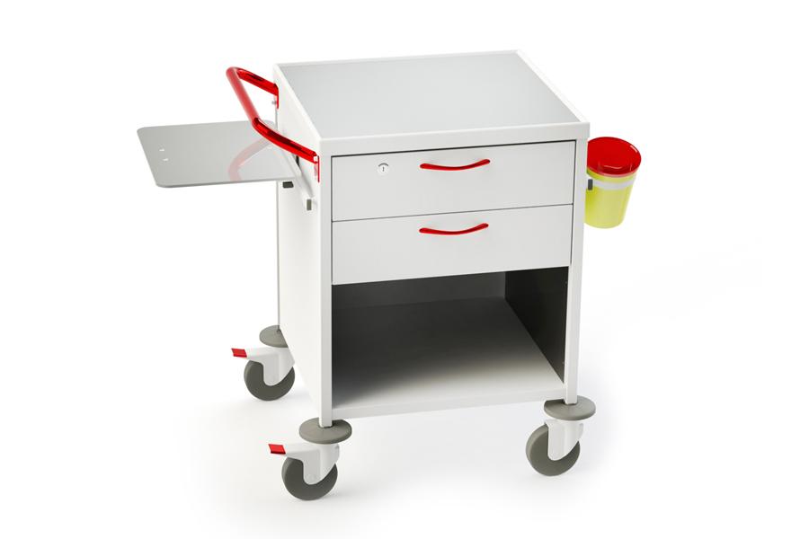 Столик манипуляционный3 выдвижных ящика и 2 съемные полки изготовлены из нержавеющей стали. Каркас выполнен из металлической профильной трубы 20х1,5 мм. Столик установлен на самоориентирующиеся колесные опоры, две из которых с тормозом.