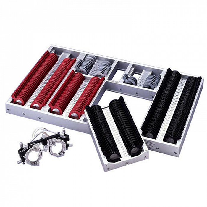 - линзы оправлены в разноцветные алюминиевые корпуса, позволяющие быстро идентифицировать и отыскать необходимый тип линзы: красные для минуса, черные для плюса, синие — для призмы и дополнительных линз;