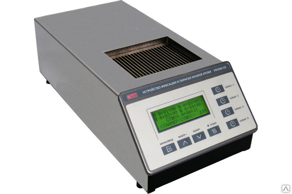 УФОМК-02 (ЭМКОСТЕЙНЕР) – компактное устройство, предназначенное для проведения операций по промывке, фиксации, окрашиванию и дальнейшему высушиванию биологических микроскопических препаратов на предметных стеклах (мазков) под контролем встроенных таймеров со звуковой сигнализацией. Устройство позволяет оптимально организовать рабочее место лаборанта для ручной окраски мазков.