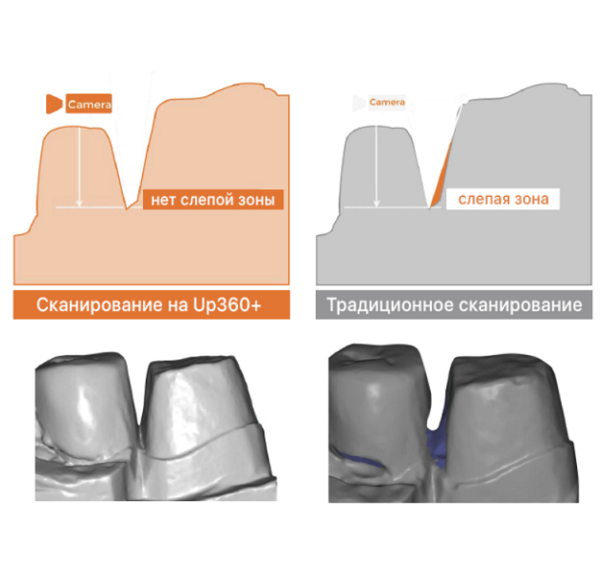 Одним из главных достоинств аппарата является отсутствие мёртвых зон при сканировании. Упрощает работу моделирования, делает работу точнее, продуктивнее. Полная дуга имплантатов сканируется за один шаг, больше не придется ослаблять или закреплять винт. Полностью комбинируется с Exocad.