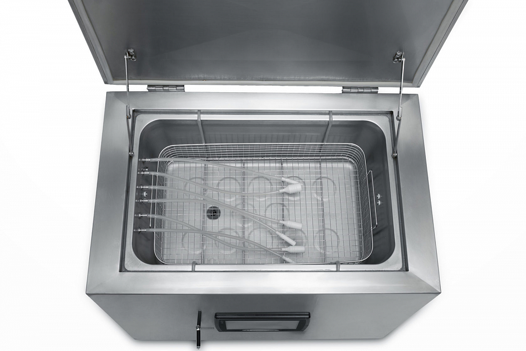 - Разложить инструмент, прикрепленный к шлангам в сетке для инструмента таким образом, чтобы ни одна часть инструмента не выступала выше уровня жидкости в ванне.