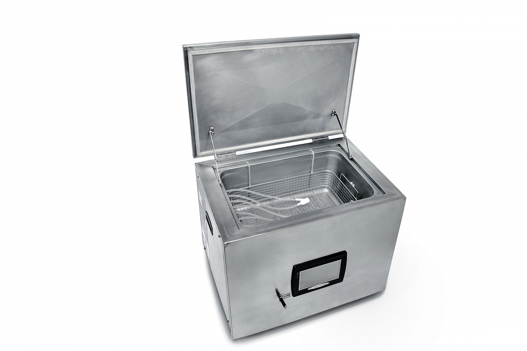 - Ультразвуковая очистка, распределённая равномерно по всему объёму моющей жидкости, достигается за счет двенадцати ультразвуковых излучателей, установленных на дне ёмкости.