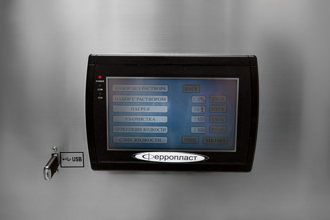 - Возможность поддержки заданной температуры моющего раствора в ёмкости в интервале от комнатной температуры до плюс шестидесяти градусов Цельсия. Функция обеспечивается встроенными нагревателями с цифровым управлением.