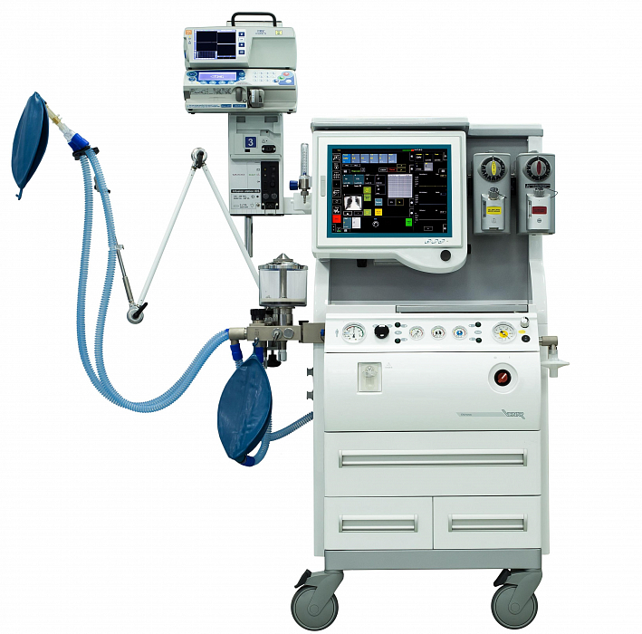 Мониторирует все параметры вентиляции вплоть до респираторной механики отображаемой на цветном контрастном TFT дисплее. Кроме того, на дисплей выводятся графики и динамические петли, характеризующие состояние дыхательной системы пациента. Высокоточный электронный ротаметр позволяет контролировать количество израсходованного газа за операцию.