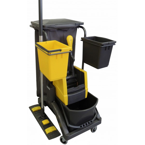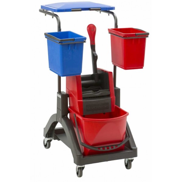 Многофункциональная тележка для влажной уборки общественных помещений. Рама-держатель мусорного мешка 70 л. с крышкой. 2 ведра по 6 литров. Механический вертикальный отжим. Ведро 17 л. цвет красный. Поворотные (шарнирные) колеса диаметром 70 мм. Держатель рукоятки. Вес: 10 кг.