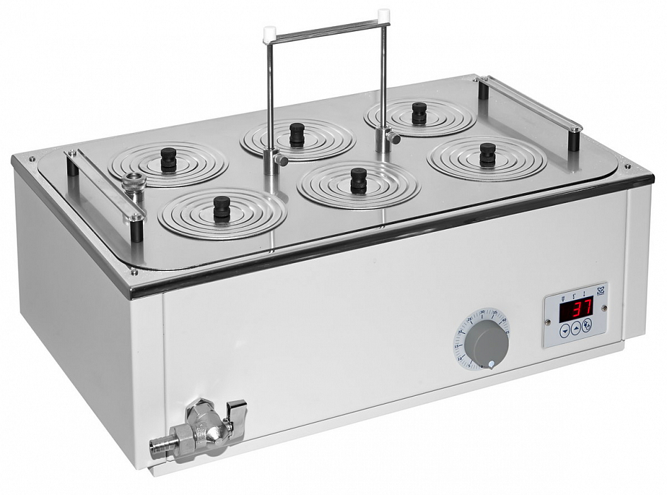 -Система из 5 концентрических колец (диаметры 26, 43, 60, 78 и 94 мм) позволяет размещать в ванне различные колбы, стаканы, чашки для выпаривания и пр.