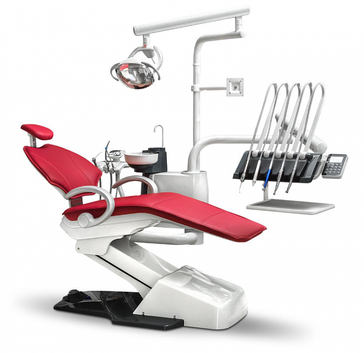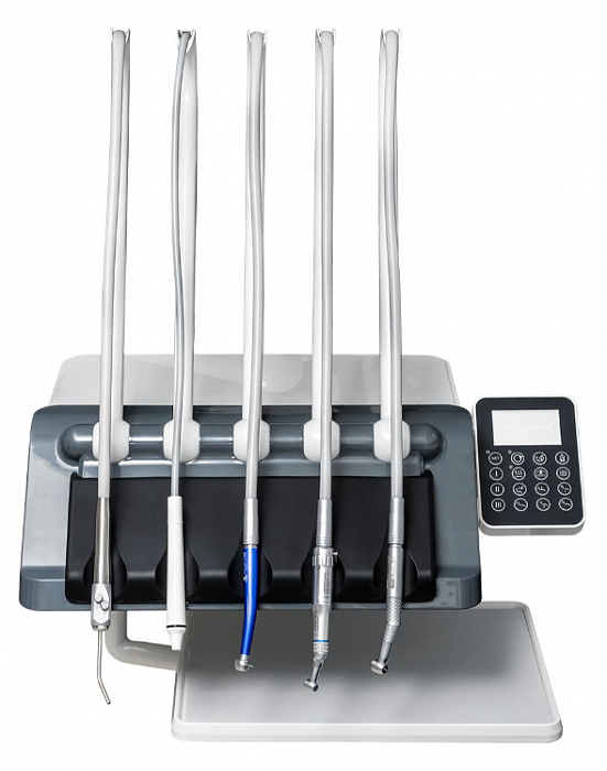 Верхняя подача инструментов пользуется большой популярностью у стоматологов. Это объясняется тем, что инструменты расположены так, что до них легко дотянуться, без необходимости поворачиваться. Соединительные шлангом контролируются надежной пружиной, которая не даст им упасть и повредиться. Блок врача установки рассчитан на 5 инструментов.