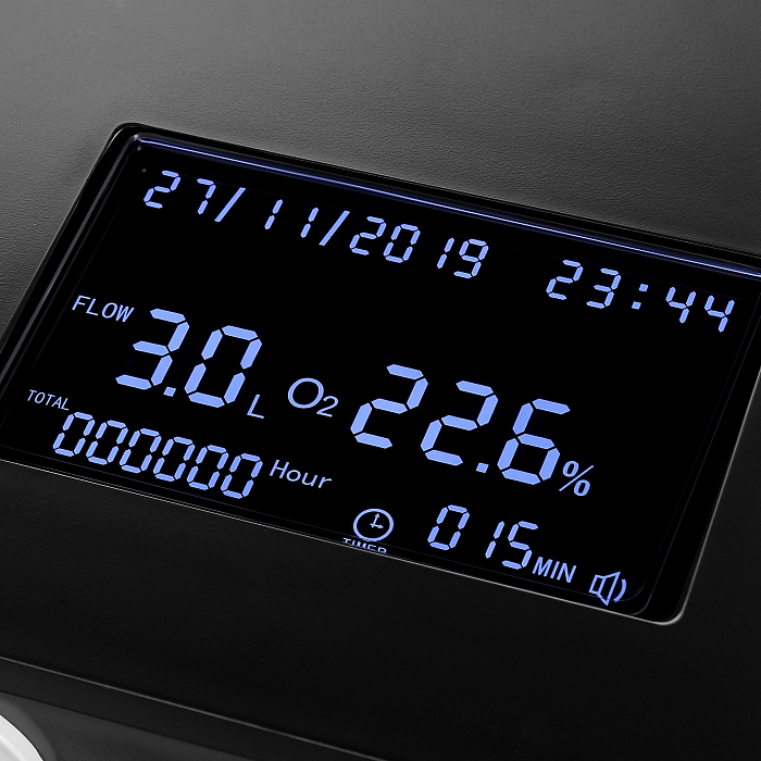 - Прибор оснащён газоанализатором, контролирующим содержание кислорода в составе кислородно-воздушной смеси на выходе из концентратора. Текущая концентрация кислорода отображается на ЖК-дисплее.