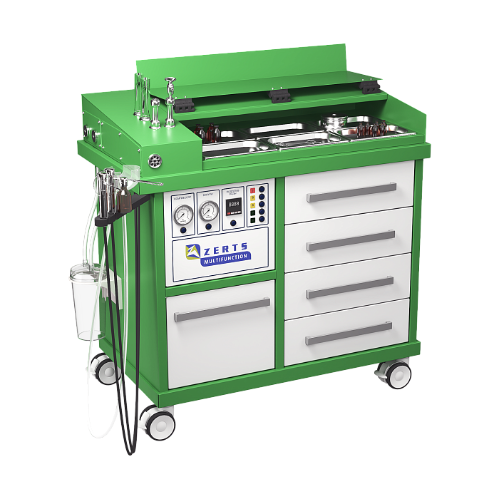 - Колчаны для стерилизации эндоскопов: Наличие 2 шт., расположенных в вынесенном металлическом корпусе в верхней части модуля тумбы, изготовлены из стекла устойчивого к стерилизации с мерной разметкой